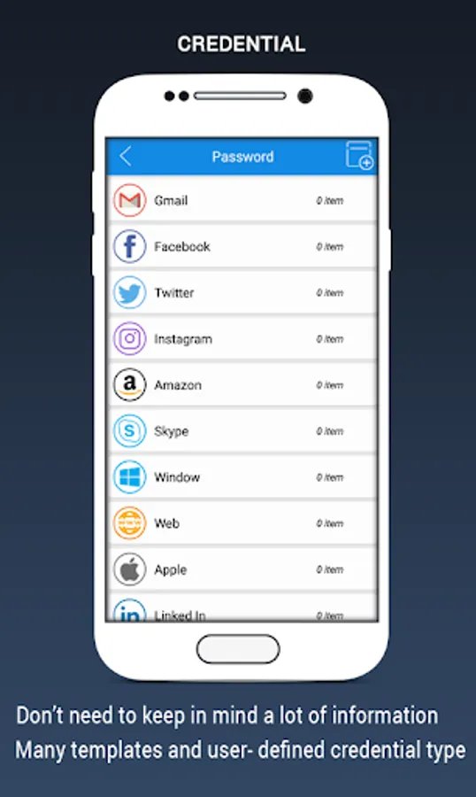 There are a lot of credentials which you need to keep in mind (email, facebook, skype....). Don't worry about this anymore, just add these information to our App. Whenever you need, just open and view/copy it. We created template for group, if you want to define yourself, just touch on add folder icon to see next steps.