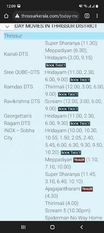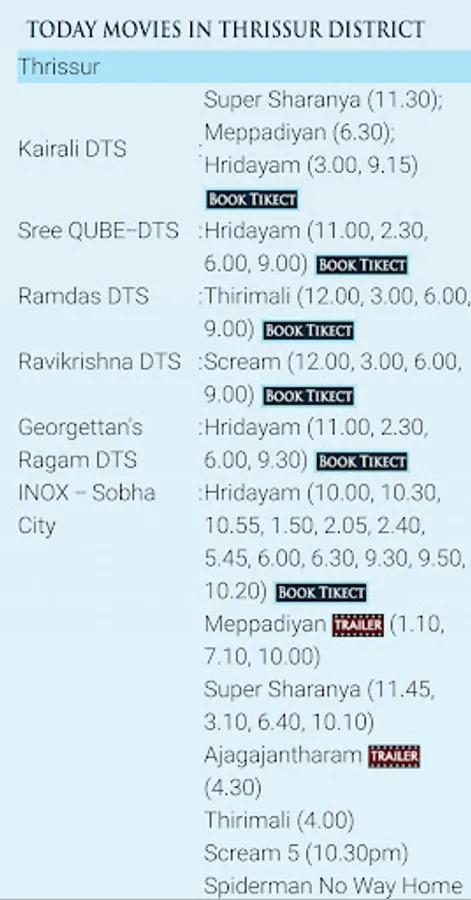 Movies in Kerala Theatres, Today Movies in Thrissur, Idukki, Ernakulam, Thiruvananthapuram, Malappuram, Kozhikode, Alappuzha and Wayanad districts. Search Today Movies in Kerala Theatres
