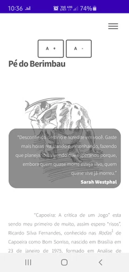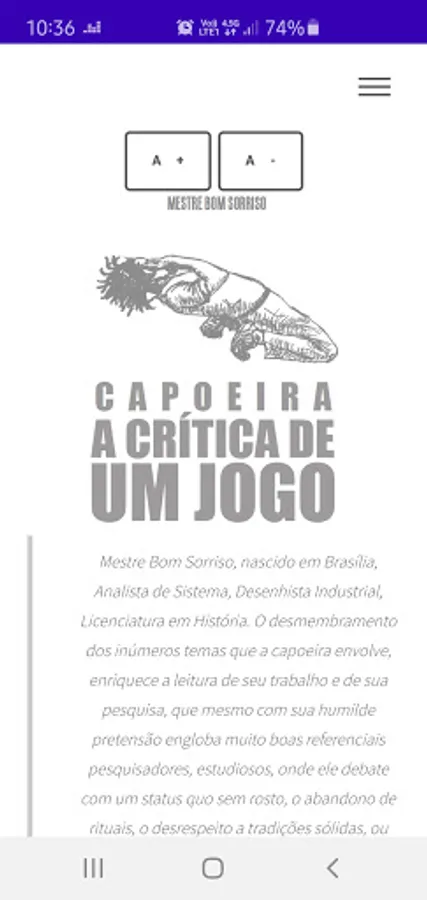 The dismemberment of the innumerable themes that capoeira involves, enriches the reading of his work and his research, which even with his humble pretension encompasses very good referential researchers, scholars, where he debates with a faceless status quo, the abandonment of rituals, disrespect for solid traditions, or even subtle attitudes that neglect the most basic foundations of Capoeira.