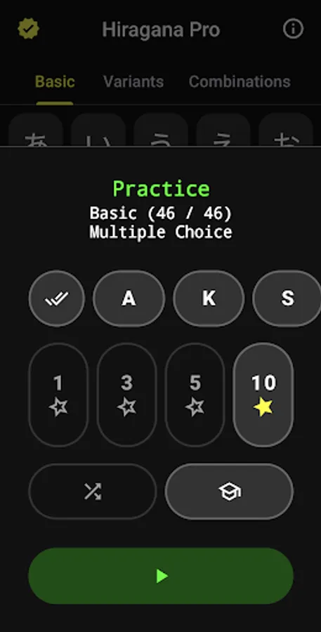 Hiragana Pro provides several tools and a game-like atmosphere to help you attain mastery of hiragana.
