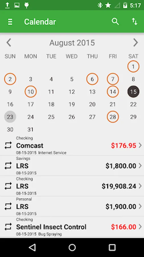 - Calendar that has days circled when bills are due and the ability to record those bills from the calendar display