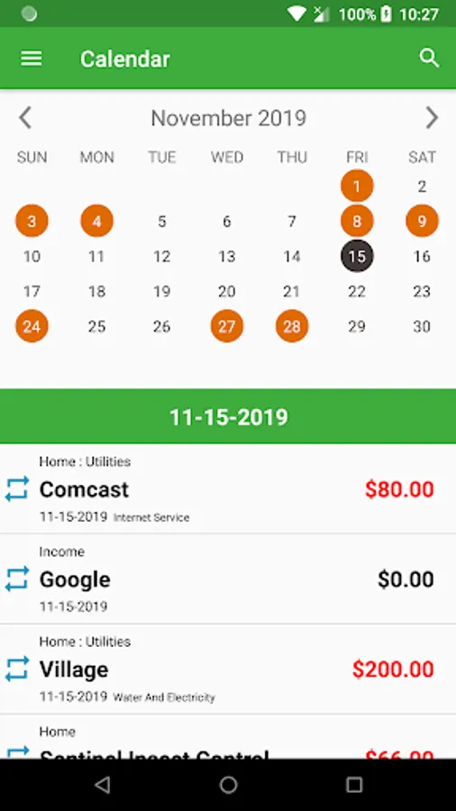 - Calendar that has days circled when bills are due and the ability to record those bills from the calendar display .