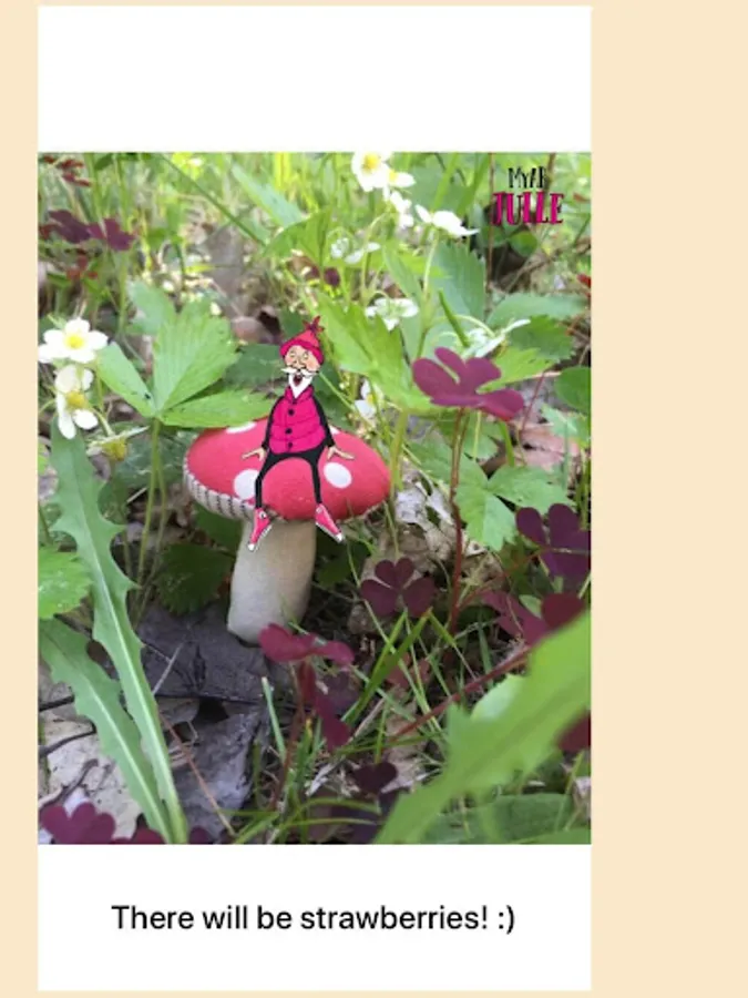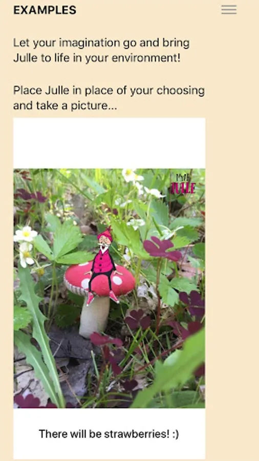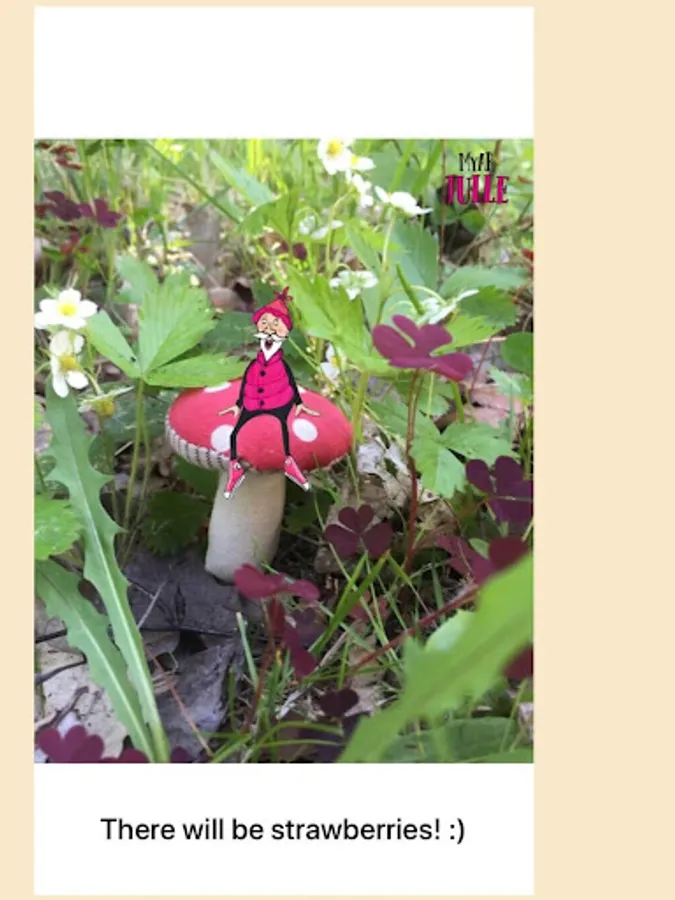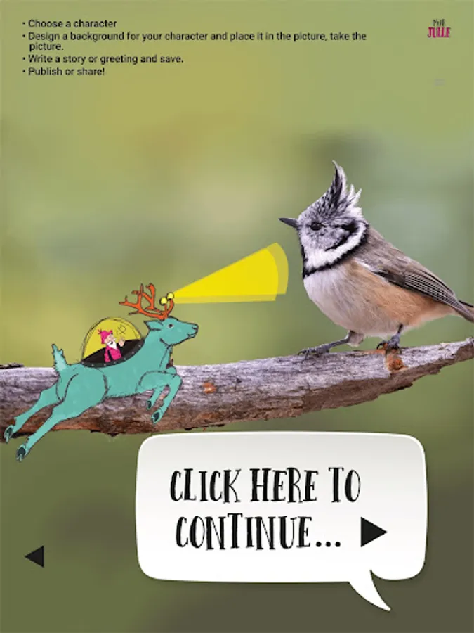 Design a background for the character, then place Julle on the picture and take the picture. Write a small story in the caption field and save the image. The image with the text will be stored in your image folder, where you can choose to share your story with the social media you prefer.