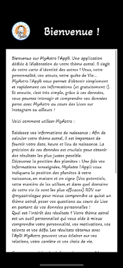 Bienvenue sur MyAstro l'Appli. Une application dédiée à l'élaboration de votre thème astral. Il s'agit de votre carte d'identité des astres ! Vous, votre personnalité, vos atouts, votre quête de Vie...