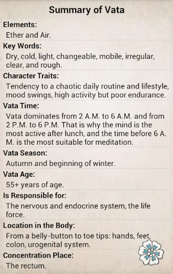 - Set of recommendations for each constitutional type: diet, daily routine, lifestyle, daily facial and body care procedures, exercising