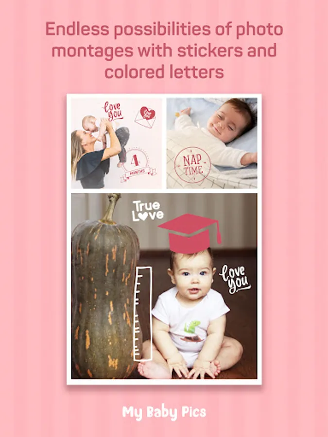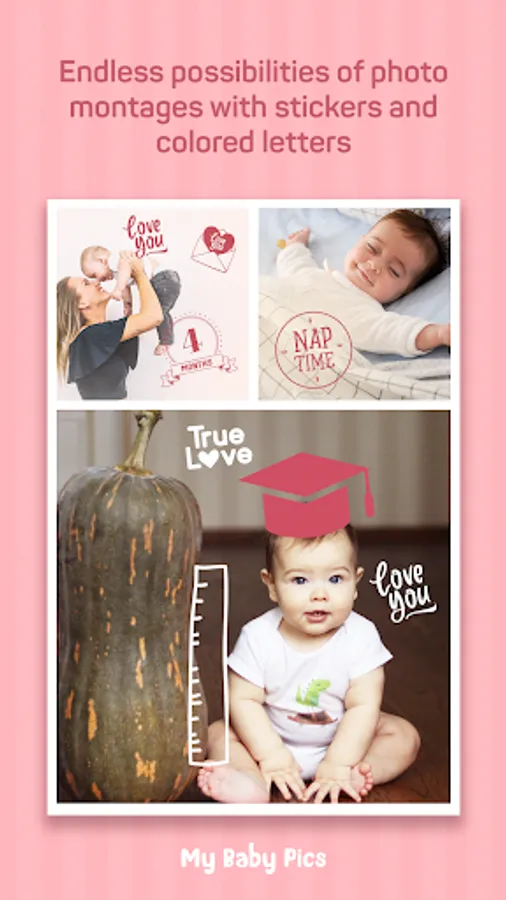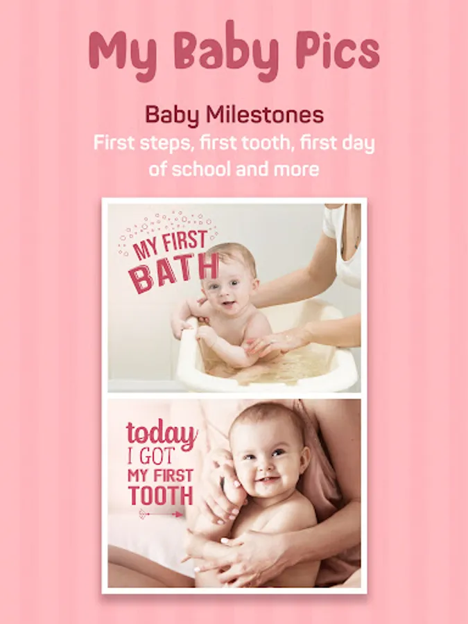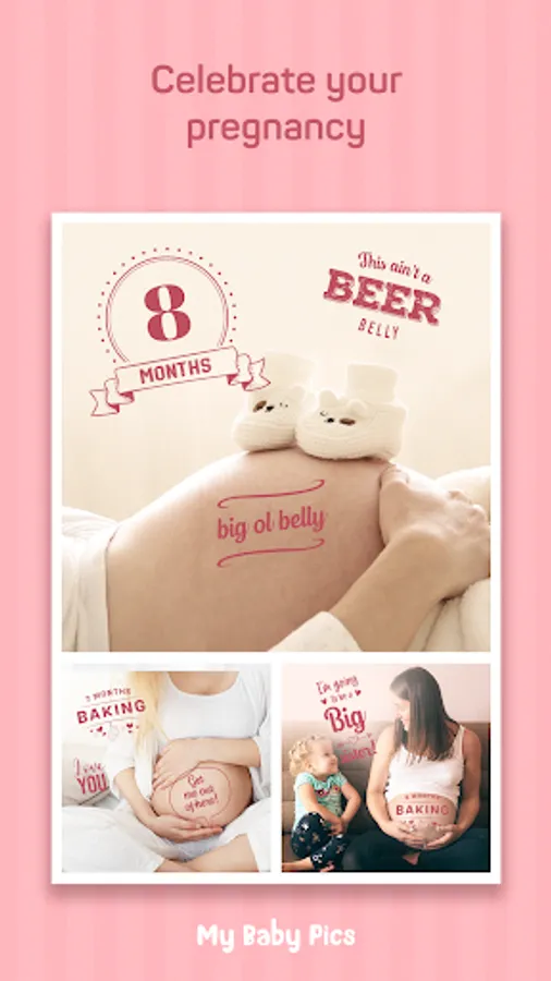 - Mark your pregnancy achievements, baby size as months go by, first steps, first baby food, first day at school, monthversaries and more with over 300 artwork and stickers organized into categories.