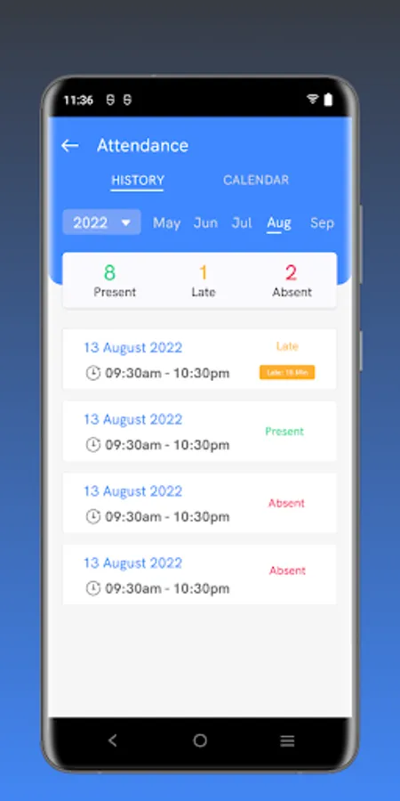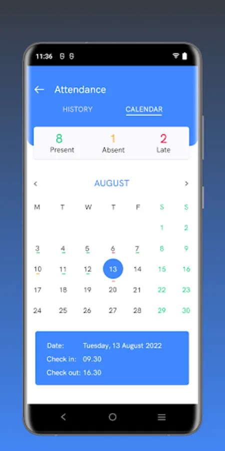 The employee can check attendance status. The App grows with your organization. Employees can check monthly wise attendance reports and date-wise attendance reports.