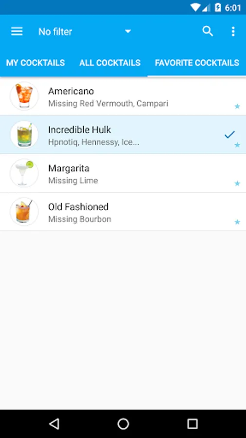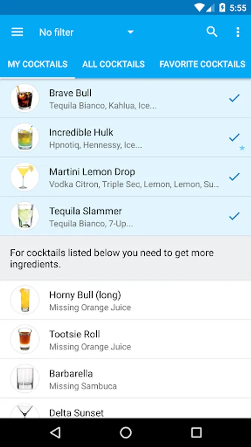 ★ BROWSE ALL COCKTAILS ★ just a list of all cocktails available. Do you really care about 9000 cocktails other applications offer? Most of them you probably won't like. We include only carefully chosen and most popular cocktails. The cocktails you can make are highlighted, you know that you can make it. For other cocktails missing ingredients are listed.