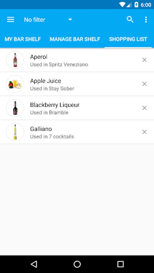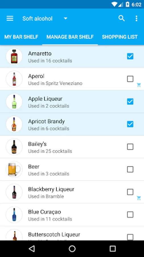 ★ MANAGE BAR ★ choose what ingredients are on your bar shelf, see how many cocktails are available with particular ingredient.