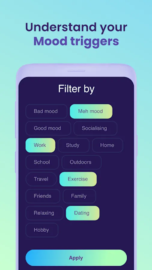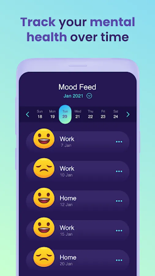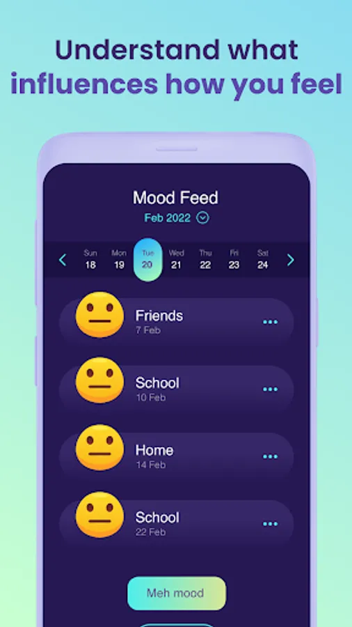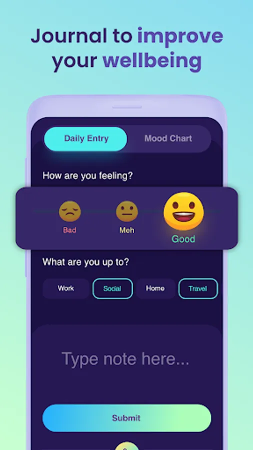 Practice regular daily self-reflection in your mood diary. Sort your moods into Good, Meh and Bad, and tag activities, like work, study and school. Add your innermost thoughts and emotions to the notes section of your diary - you can choose to share your mood, but your notes will only ever be visible to you.