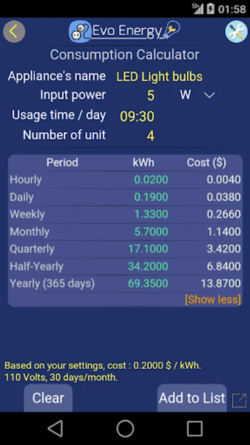 Try calculate for the estimate running cost of energy consumption with EvoEnergy app.