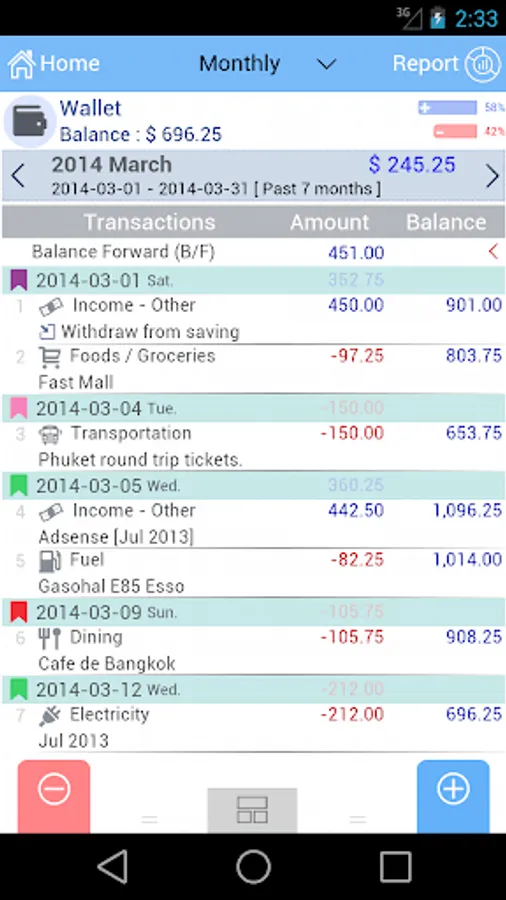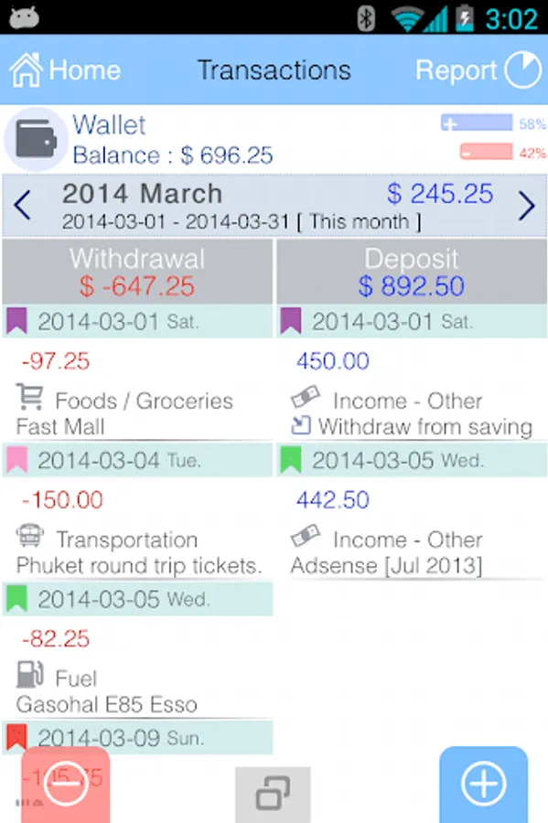 The most intuitive UI with two transaction lists design, you can scroll and view both income and outcome transactions separately and easily. Clean, fast and super easy input screen without any unnecessary fields. The app allows you to enter an empty (zero amount) transaction, then you can enter all the detail when you have a time.