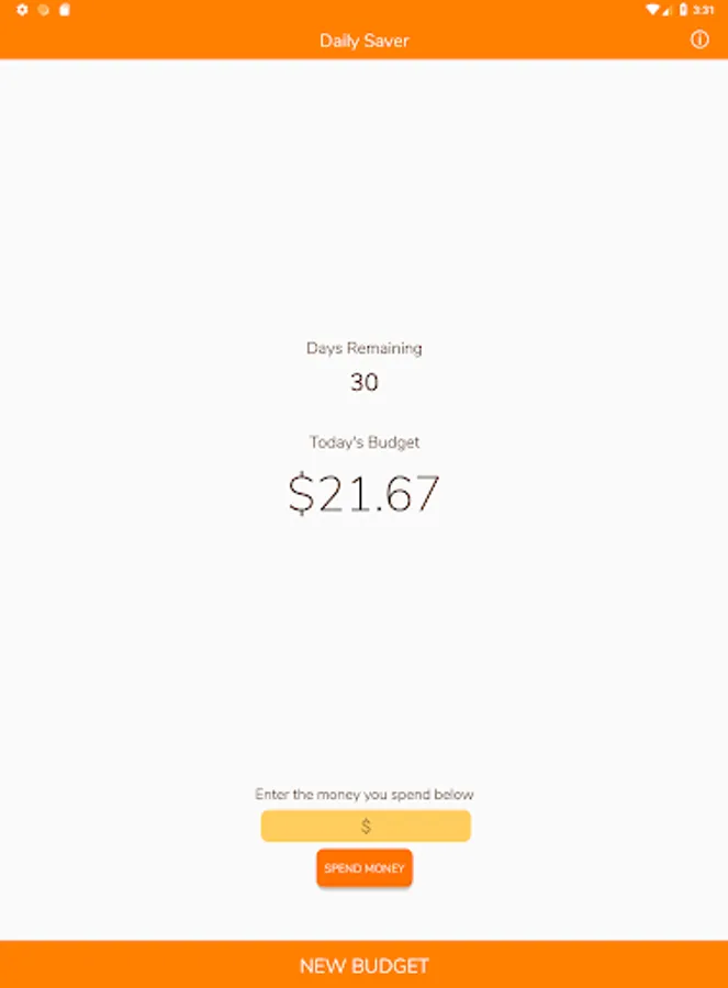 The Daily Saver App is a tool to help you save money. You simply tell it how much money you would like to spend, and the amount of days you would like that money to last. The Daily Saver App will then display how much you can spend each day. At this point all the user needs to do is input the money they spend. As each day goes by, the Daily Saver will re-average your daily budget.