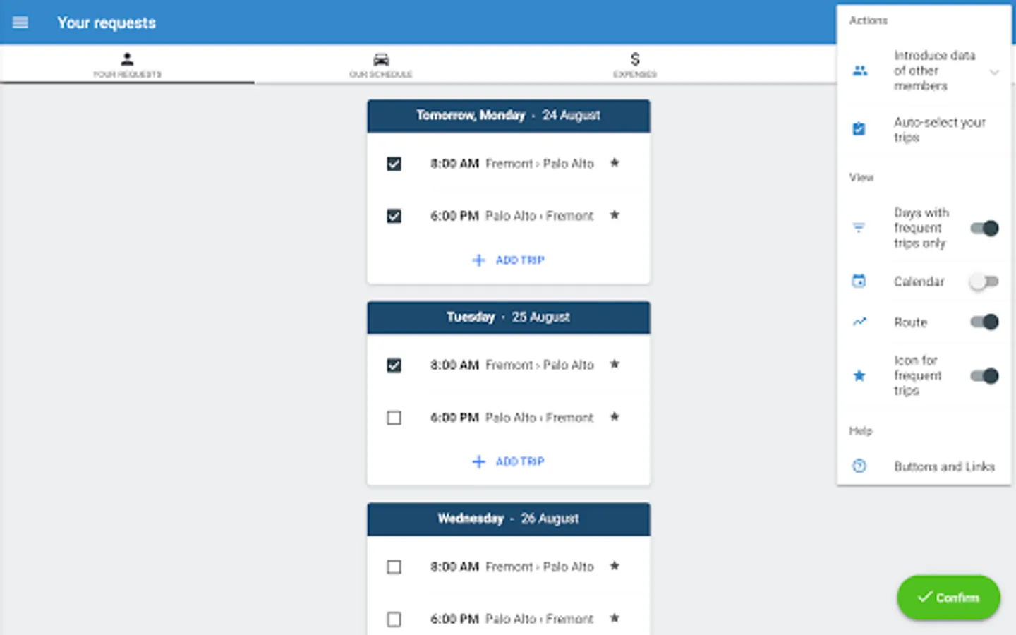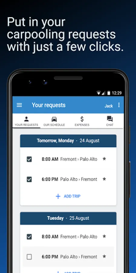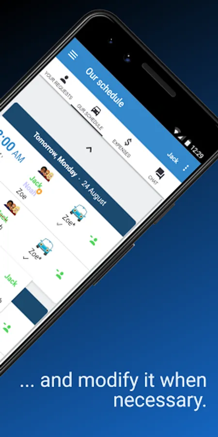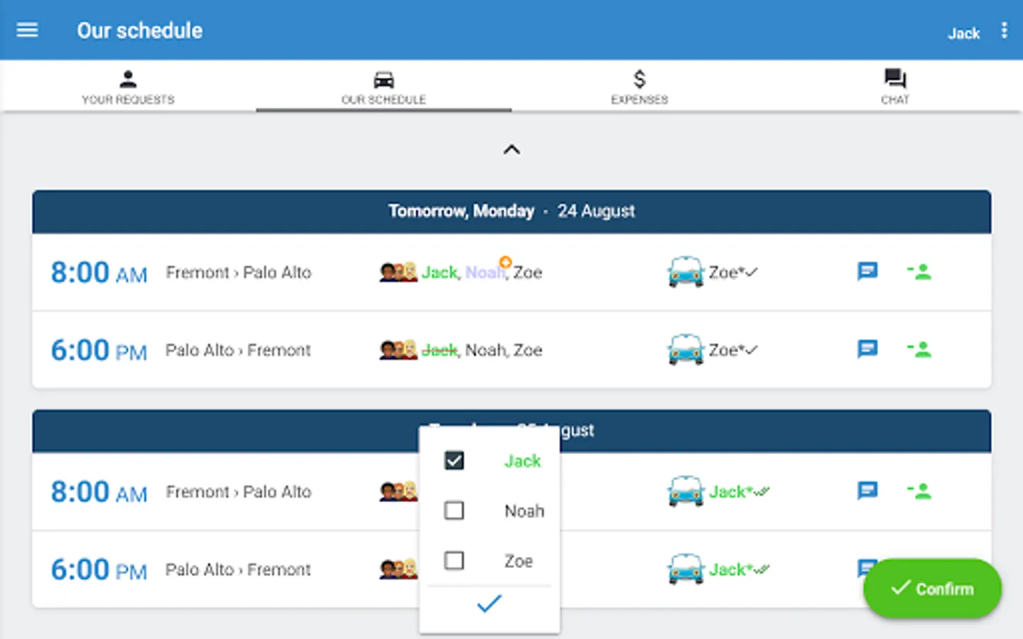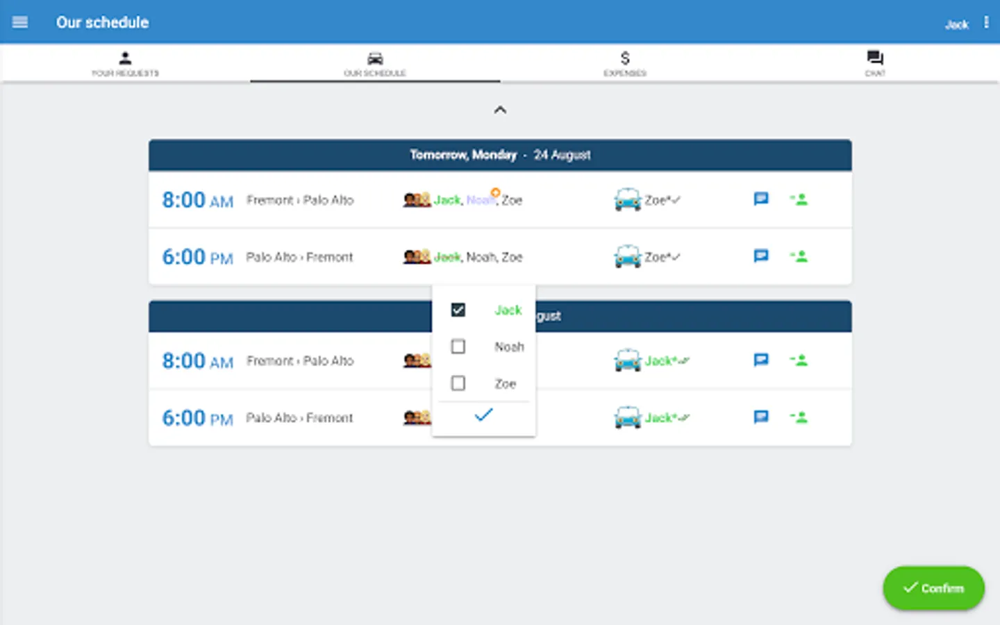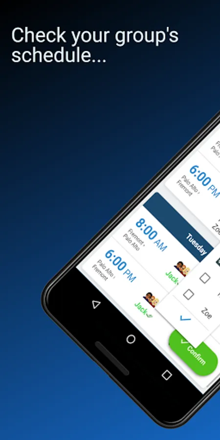 • Each user can select routes, days and times from the schedule of your carpool in a few seconds.