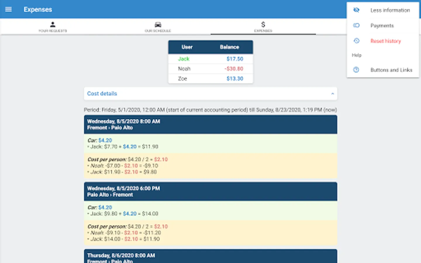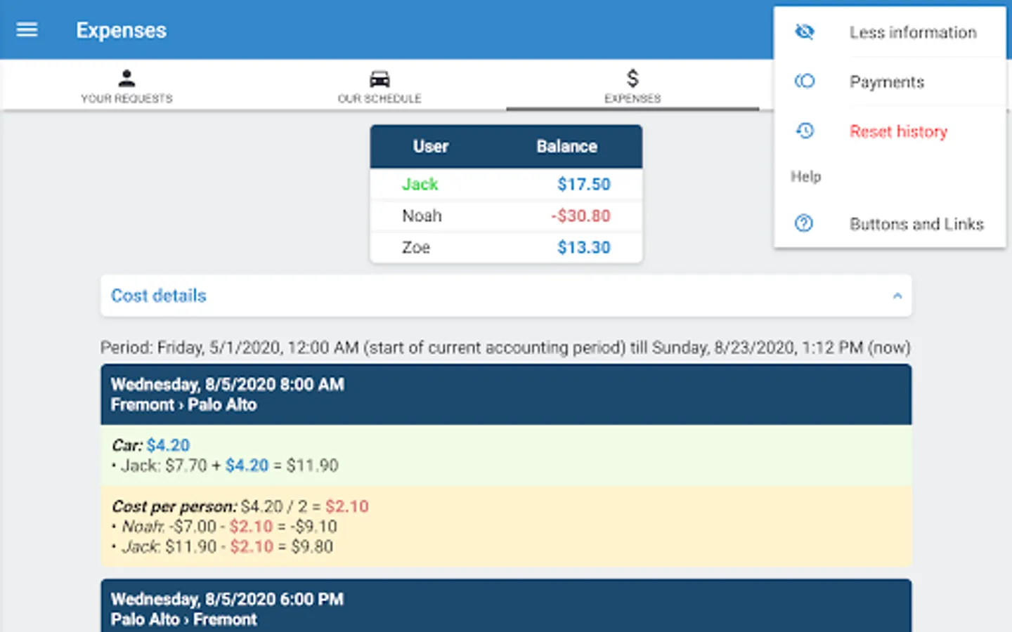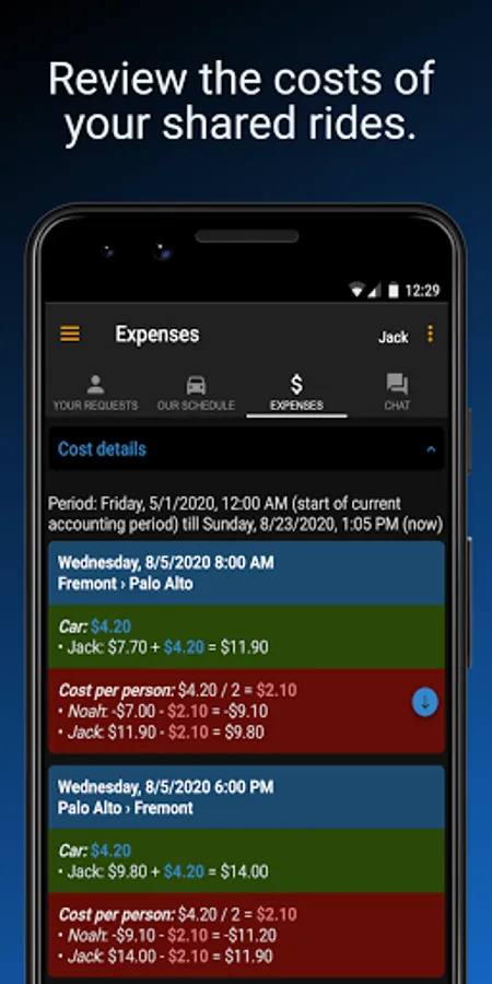 According to the requirements of your carpool, you can simply use MyCarpoolApp to know always who of your buddies wants to share a ride and whose turn it is to drive. If you have more advanced needs, MyCarpoolApp helps you estimate reliably and easily the costs to share either by assigning fixed amounts to each or your routes, or by taking into account variables like fuel type and fuel consumption of each car, highway tolls, discounts, and other costs per mile.