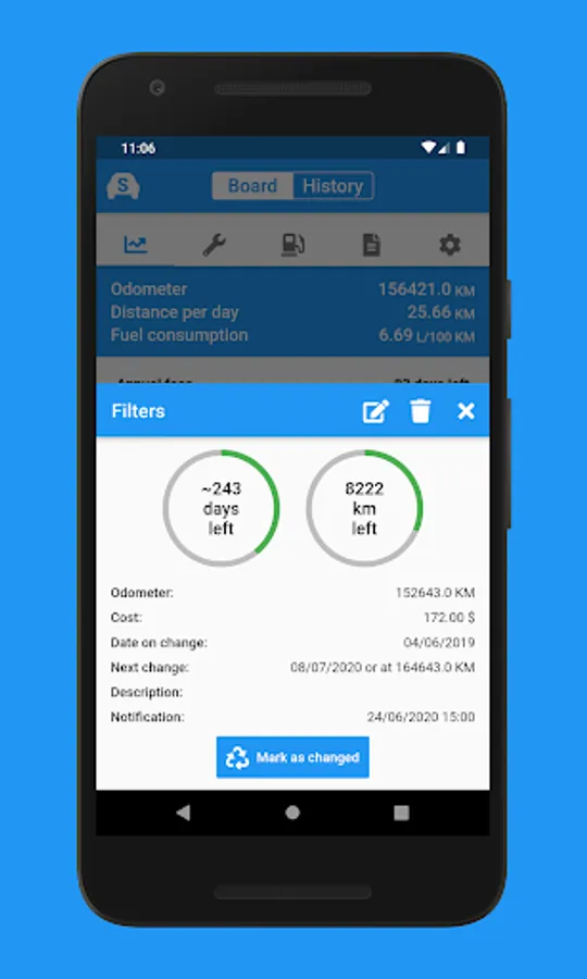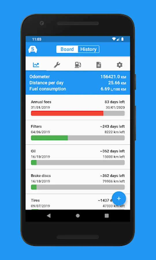 Your personal car manager. The application aims to help you manage your car by record your maintenance events - part changes, document updates, refueling, etc and allows you to easily keep track of what you need to do next by notifying you of upcoming changes according to your schedule. Lightweight, easy to use and requiring no internet access or specific permissions, My Car Service is the easiest, most light-way product for the task. Never forget to repair your vehicle by receiving notifications for the next oil change, tires change, filters change and more. Record your car insurance, technical inspection, driving license and more.
