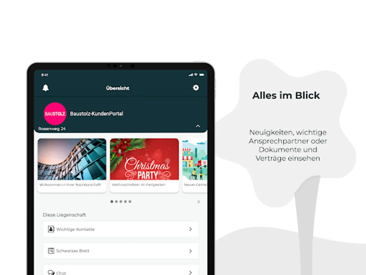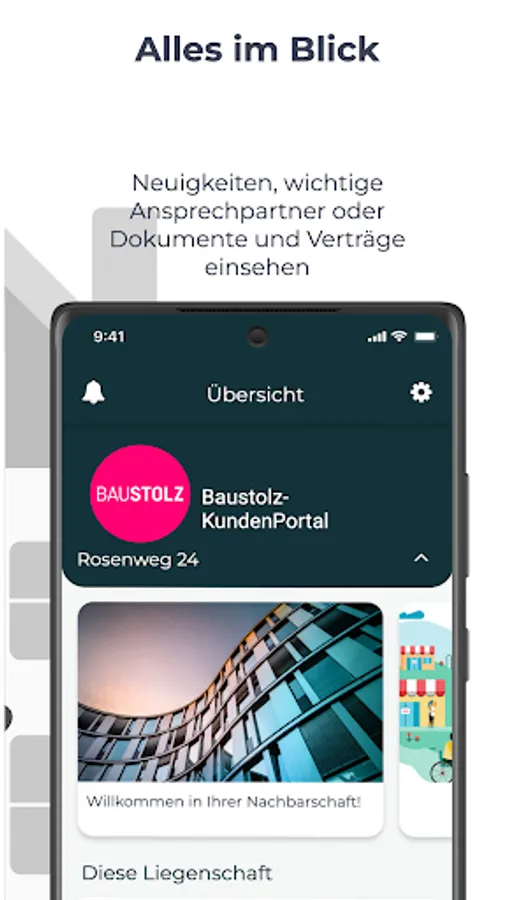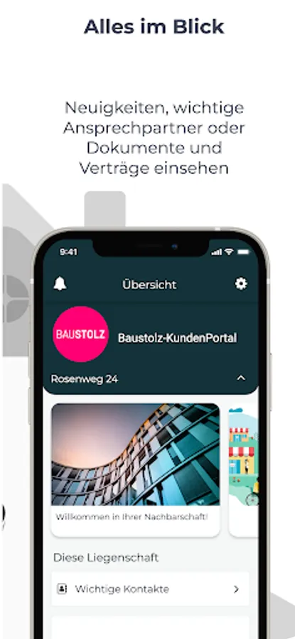 Welcome to the digital companion for living the Baustolz Customer Portal. Replace regularly with all those who belong to the Baustolz Customer Portal, from: residents, owners and your property management.