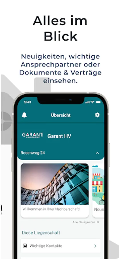 Functions: • Password-protected access • Overview of important contact persons and emergency contacts • Access to important messages and appointments • Access to relevant documents at any time • Processing of (damage) reports, key orders, etc. directly via smartphone including the current processing status