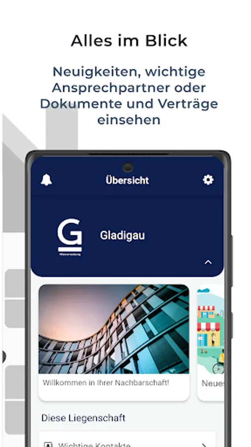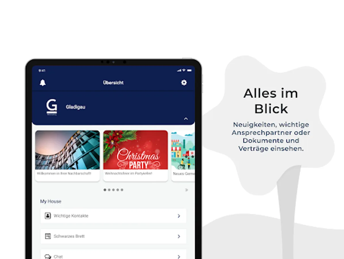 Welcome to the digital world of Gladigau Immobilien. Contact us directly and clarify your concerns quickly and easily. Here you will find all the relevant information about your apartments/commercial unit. Use the following functions in particular: