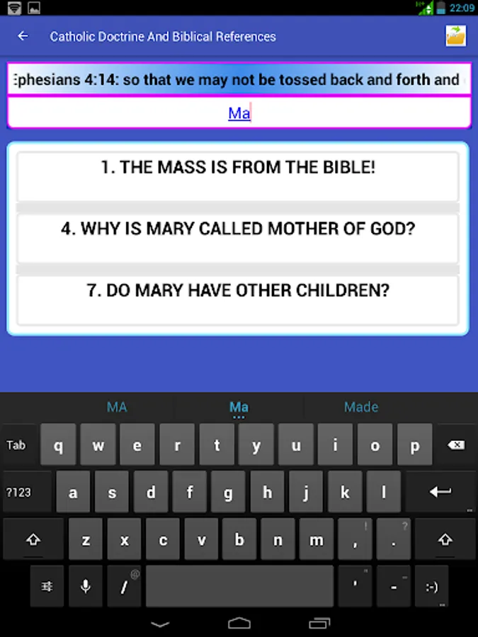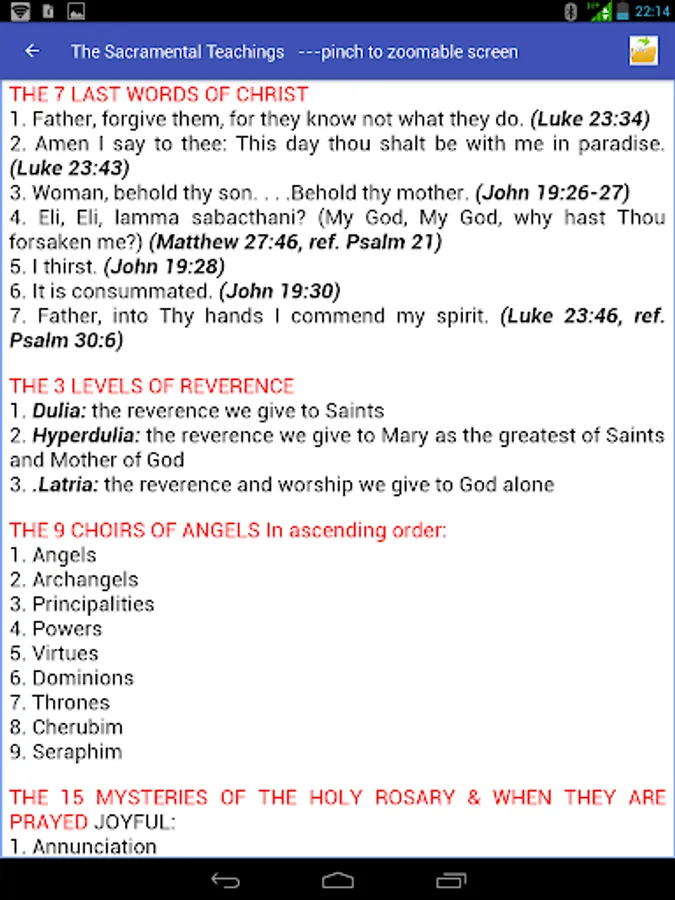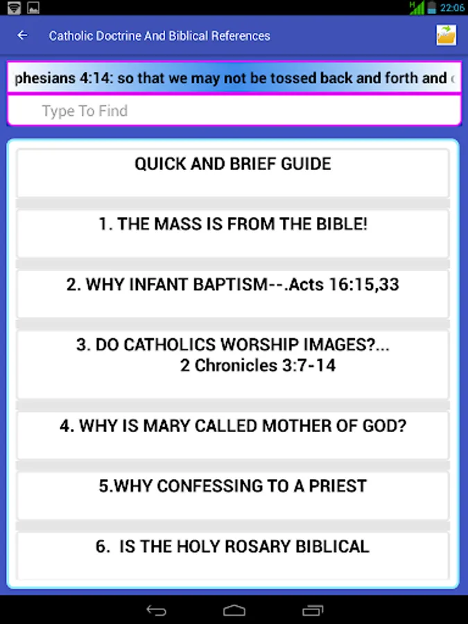 Catholic Doctrine and Biblical References is an app, which uses the scripture to explain Catholic faith/Doctrine issues like: Holy Rosary, Holy Eucharistic Celebration, PURGATORY, images, Confession, calling Rev Father, Holy water etc.