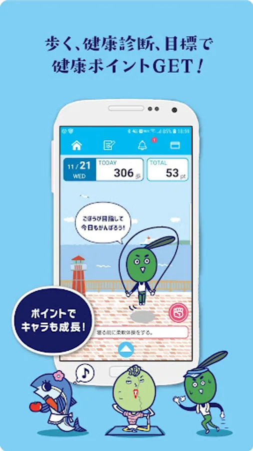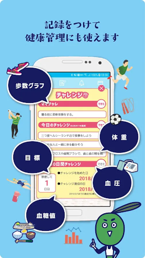 Let's set a goal (my chare) for my health promotion that continues every day and challenge every day. In the app, the original character will support your health promotion. Aiming for the ideal body and reward with Orisuke, Hamami, and Beautiful Letako, a health challenge every day!