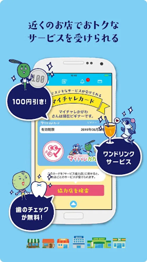 ○ You can receive the service at the cooperating stores from the time you get the beginner card. Even if the card ranks up, the service content is the same. The card will be displayed on the screen of the app when you reach the health points.