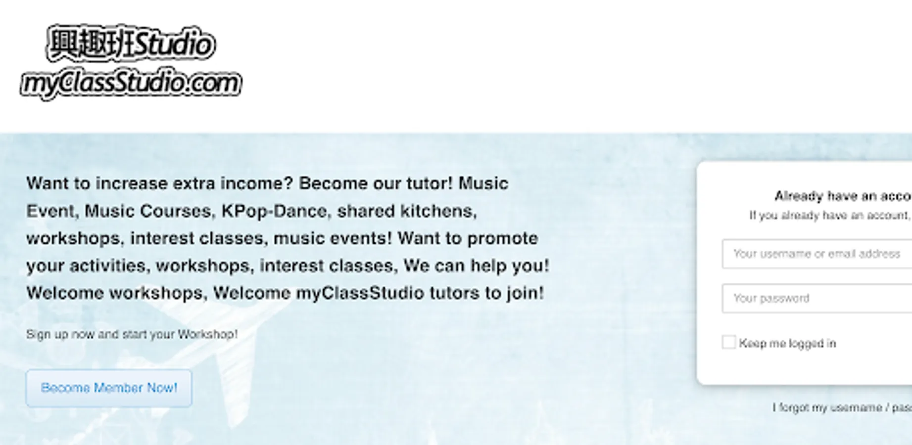 Want to increase extra income? Become our tutor! Music Event, Music Courses, KPop-Dance, shared kitchens, workshops, interest classes, music events! Want to promote your activities, workshops, interest classes, We can help you! Welcome workshops, Welcome myClassStudio tutors to join!