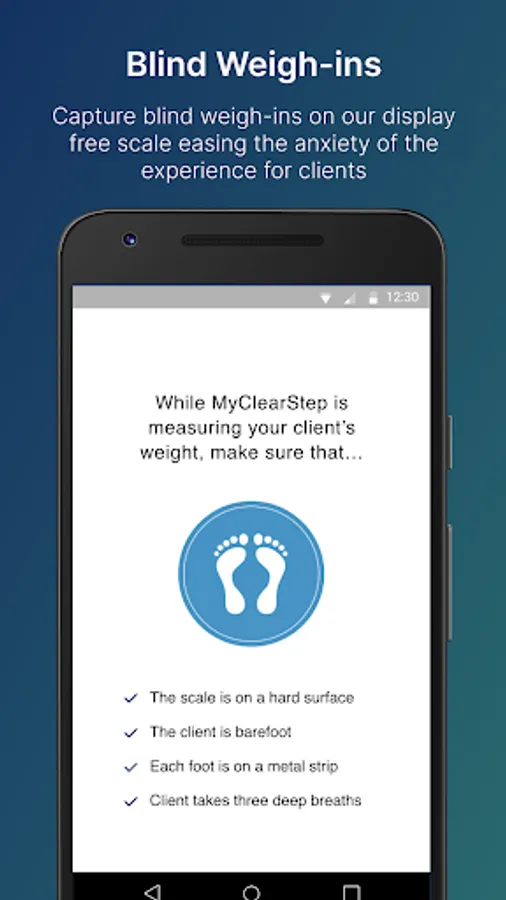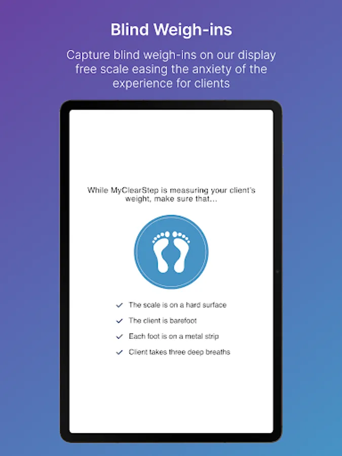 MyClearStep for Admins is a solutions for clinicians to capture weight and blood pressure for patients. Pairing with the MyClearStep numberless scale and blood pressure cuff, patients can complete an anxiety free blind weigh-in at your office or treatment center. All data captured is instantly available in your portal and analyzed by the MyClearStep system for abnormalities in order to alert you and your team.