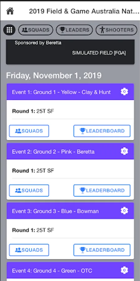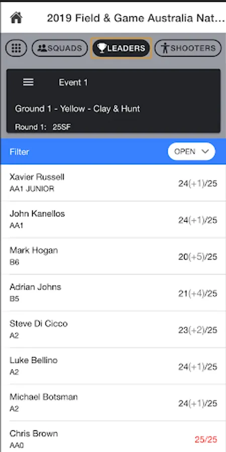 Once you have selected the shoot you are interested in you can view the events within that shoot, see who is leading for each event and review the complete scores for each competitor. If you are viewing a currently in progress shoot you can "pull down to refresh" at any time to retrieve the latest scores.