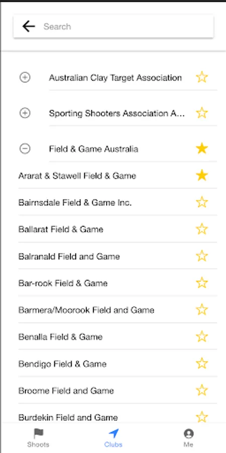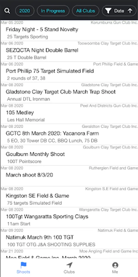 The app allows you to find a club via a location search. Once you have found a club you are interested in you can "Follow" them so they are remembered the next time you use the app or you can select "Shoots" to see past results, future programs and currently in progress shoots.