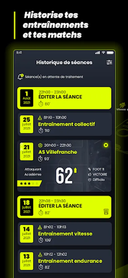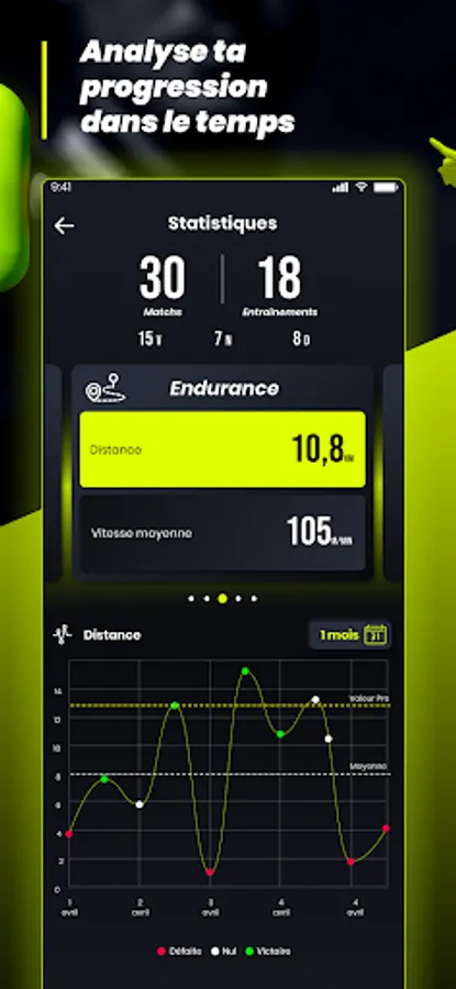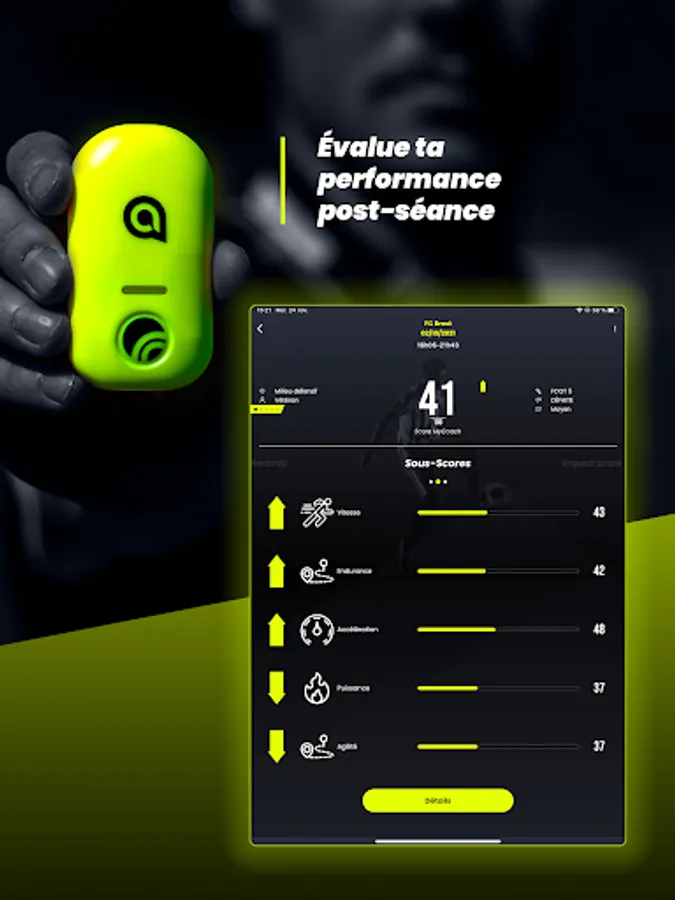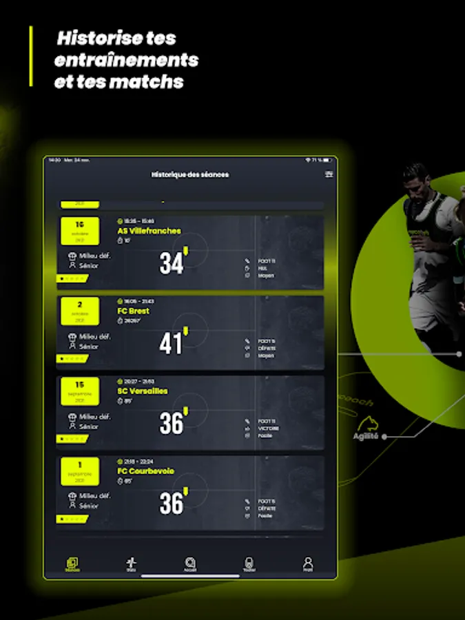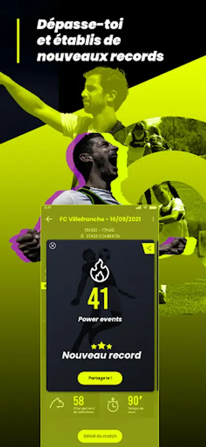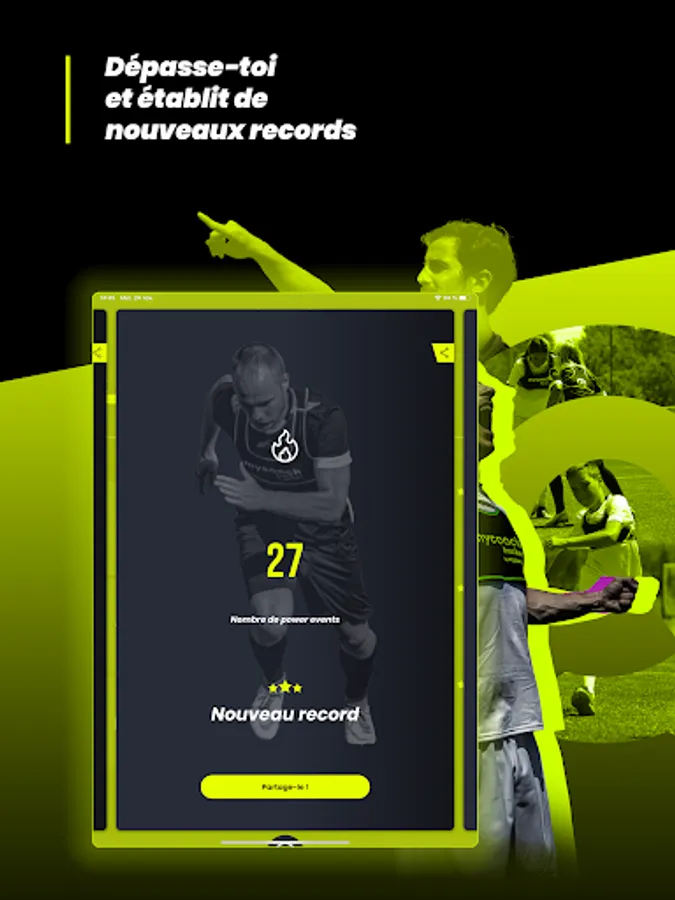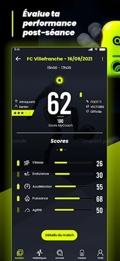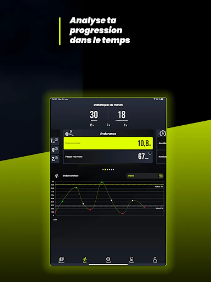 The application allows you to retrieve the data recorded by your MyCoach Tracker, to discover the extent of your performance in football matches or training and to share your results with the community.