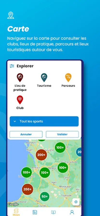 Thanks to the map of points of interest, practitioners can consult all the information on the places where their sport(s) are practiced.