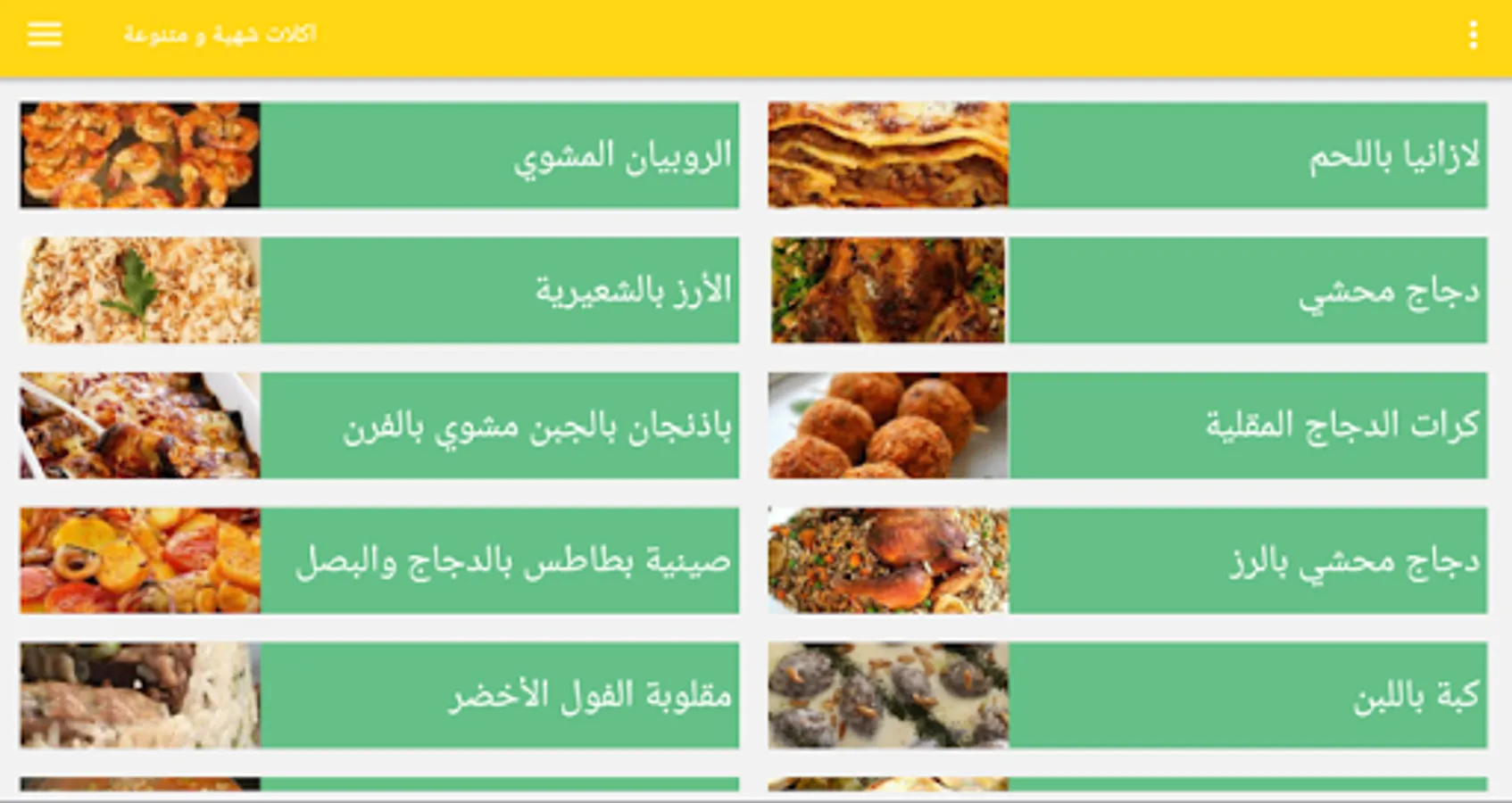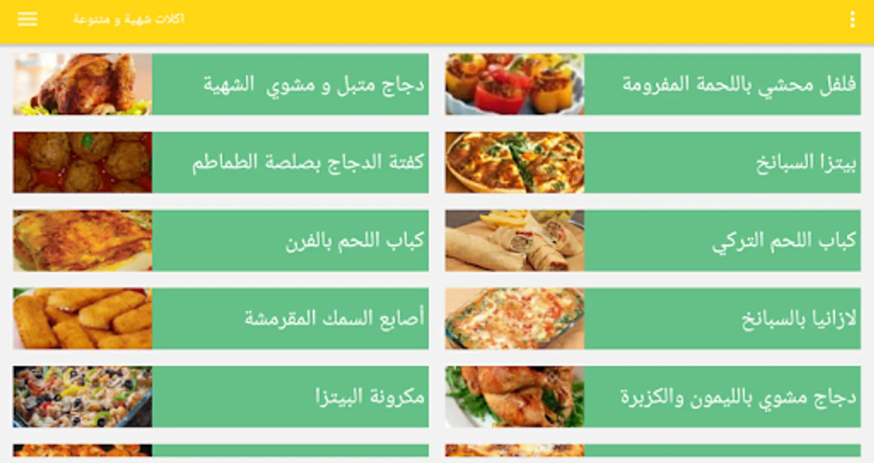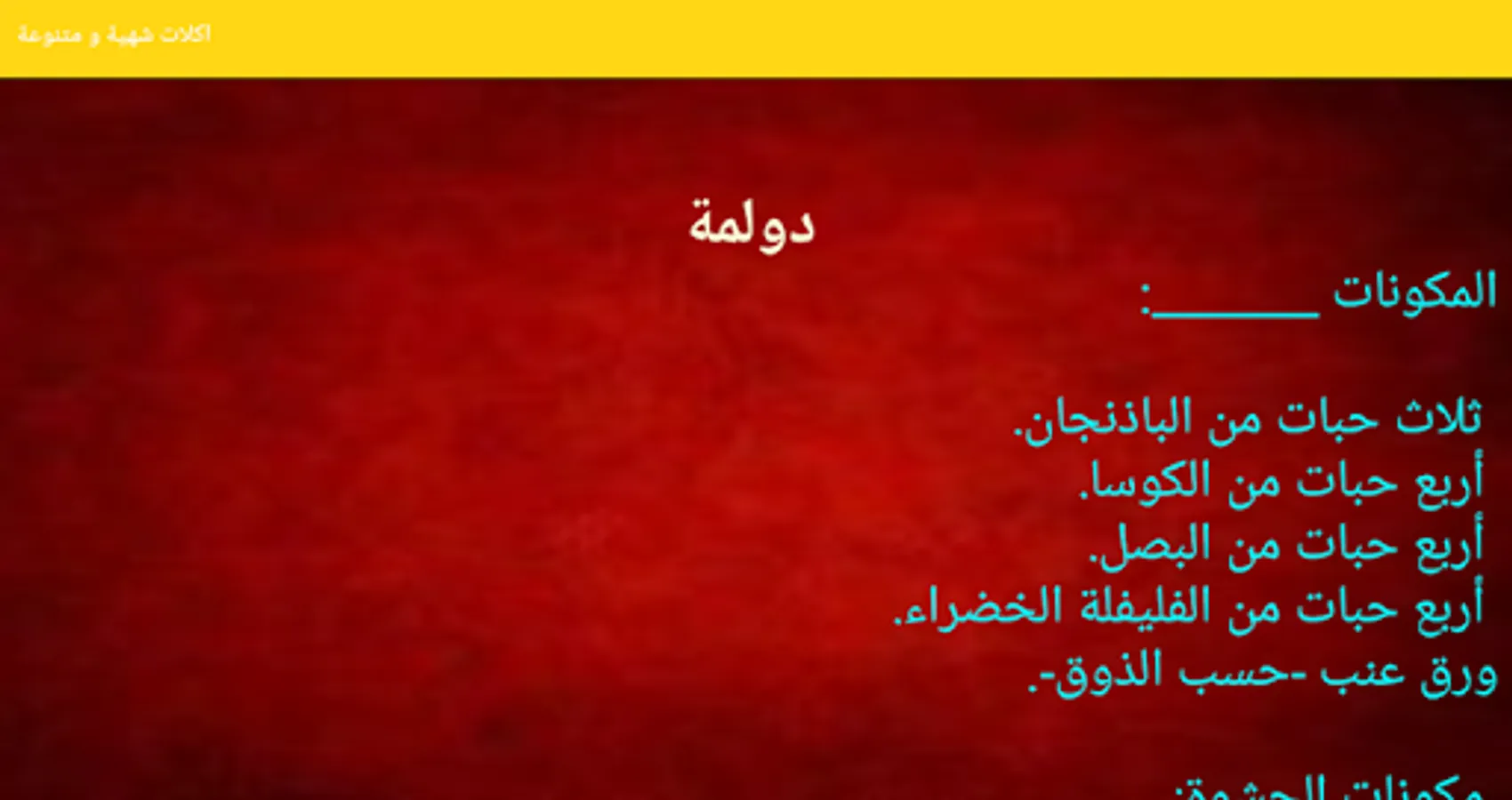 The app contains a wide range of cooking recipes from Arabic and Western cuisine. The recipes vary from main dishes to fast food