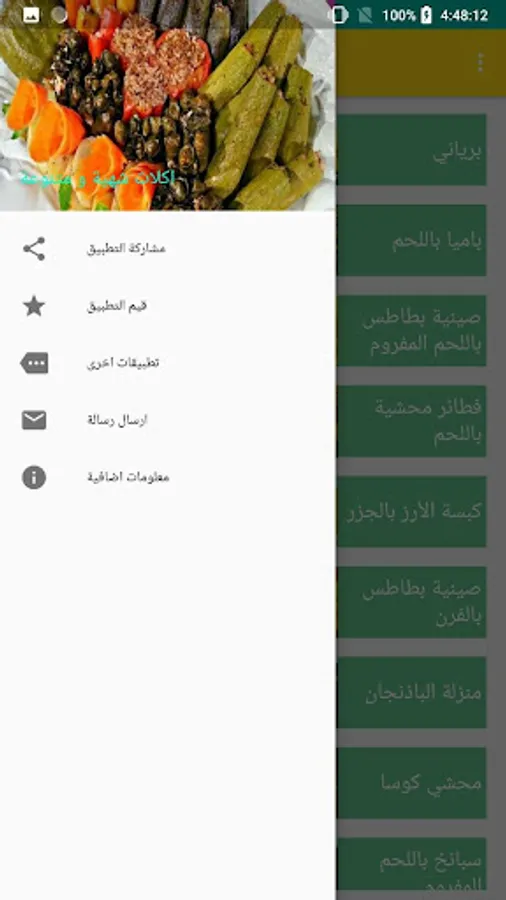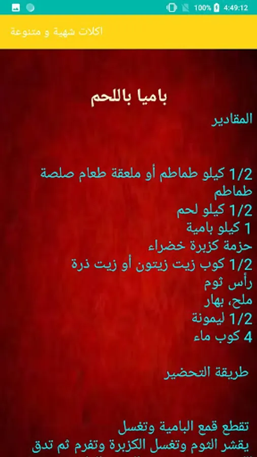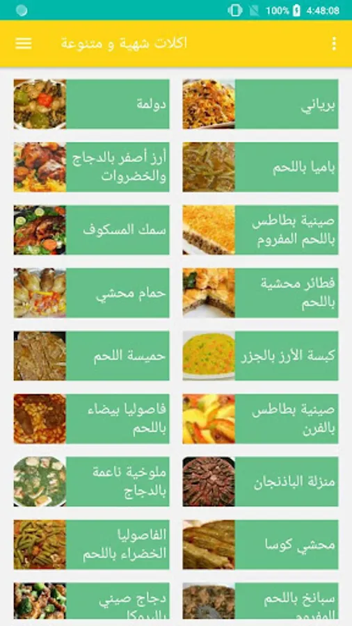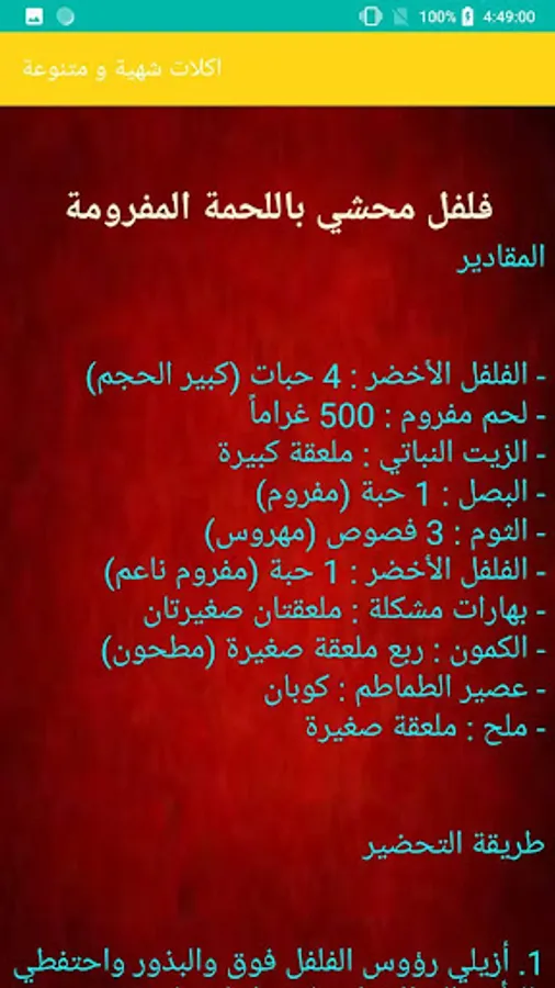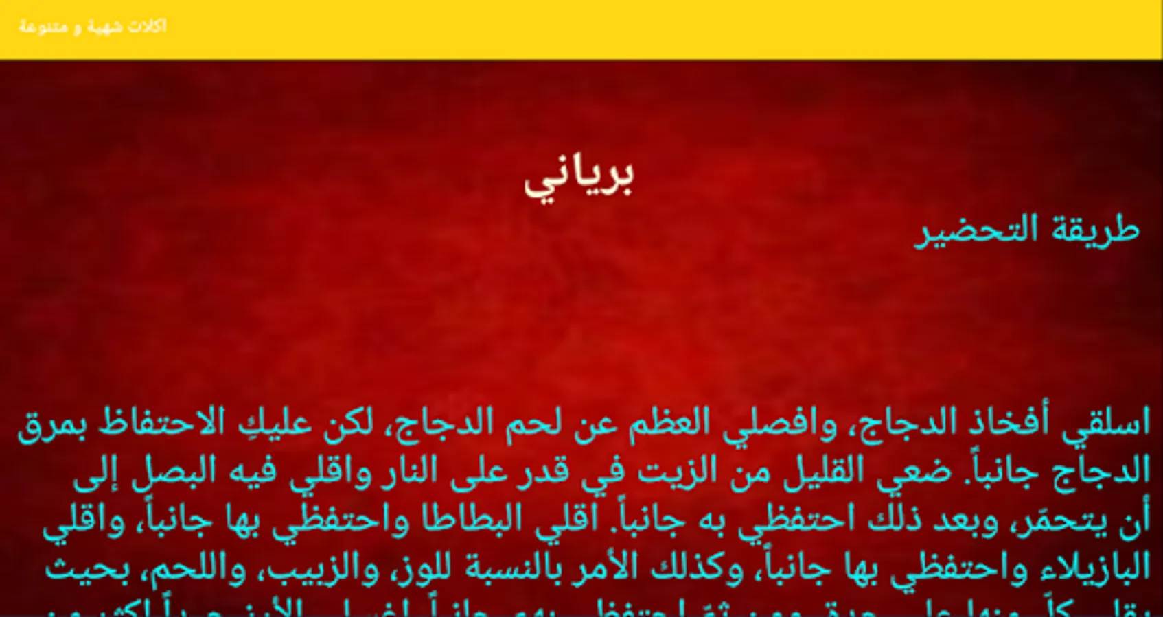 The app contains a wide range of cooking recipes from Arabic and Western cuisine. The recipes vary from main dishes to fast food