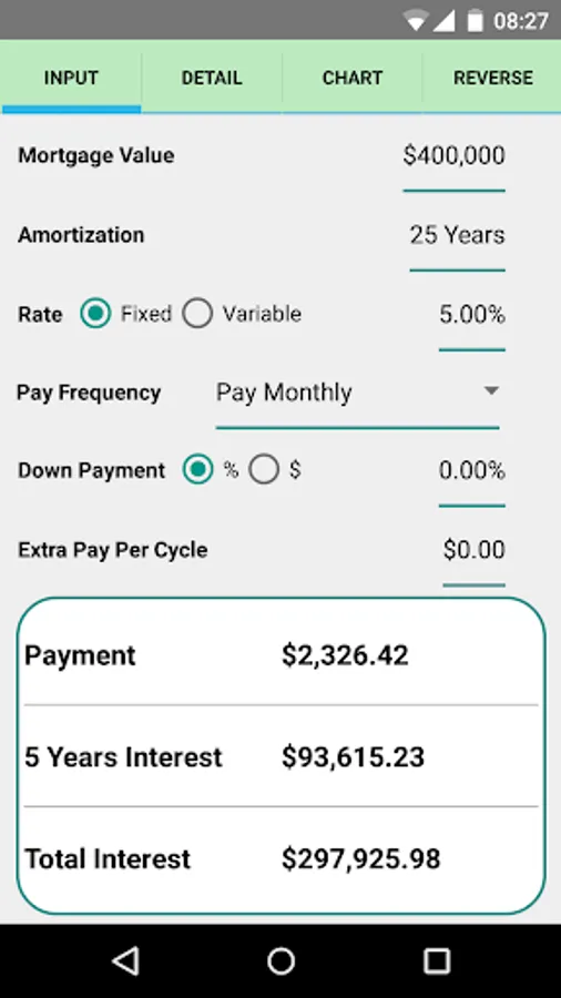 The INPUT tab provides a quick and simple way to calculate your mortgage payment, first 5 years interest, and total interest paid at the end of term.