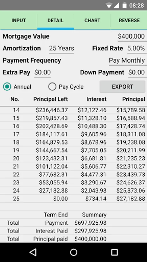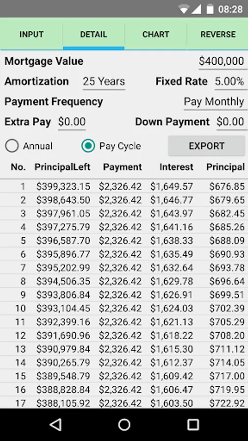 The DETAIL tab let you browse through your mortgage annual payment summary and every single payment detail. It also let you export the details to a CSV file and send it to anyone or share it in the cloud.