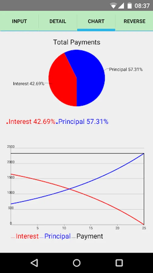 The pie chart provides a visual representation of the percentage of total interest and principal paid at the end of term. The XY-axis chart represents how interest and principal composition change in the payment from beginning to the end of mortgage term.