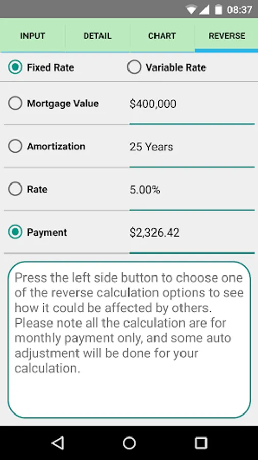 There are four major factors in mortgage calculation: Mortgage Value, Amortization, Rate, and Payment. REVERSE tab provide a calculate option of any factor when you give the other three.