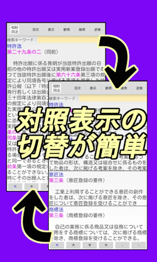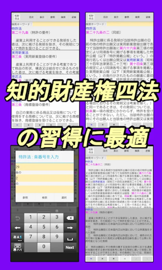 Please use it to learn the four legal texts related to intellectual property rights: patent law, utility model law, design law, and trademark law.
