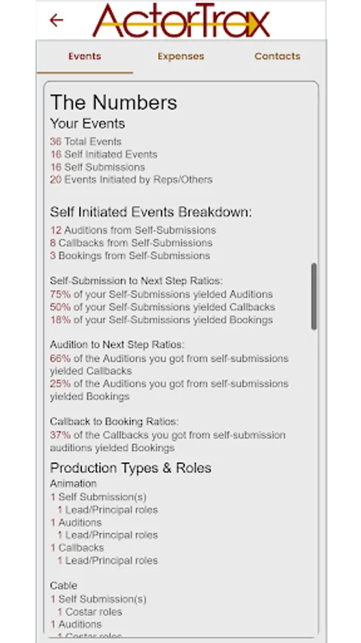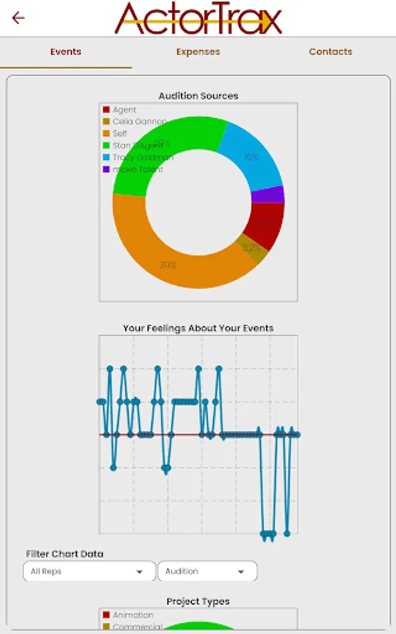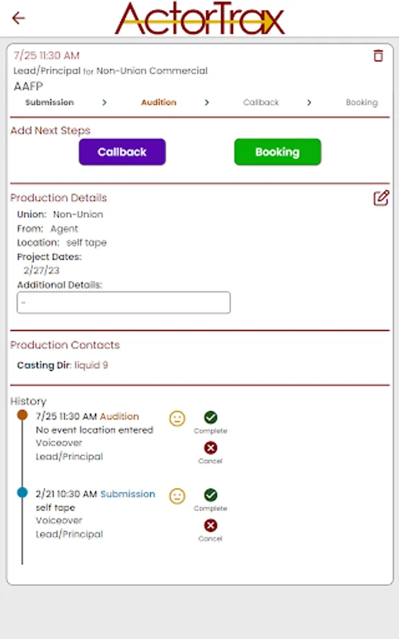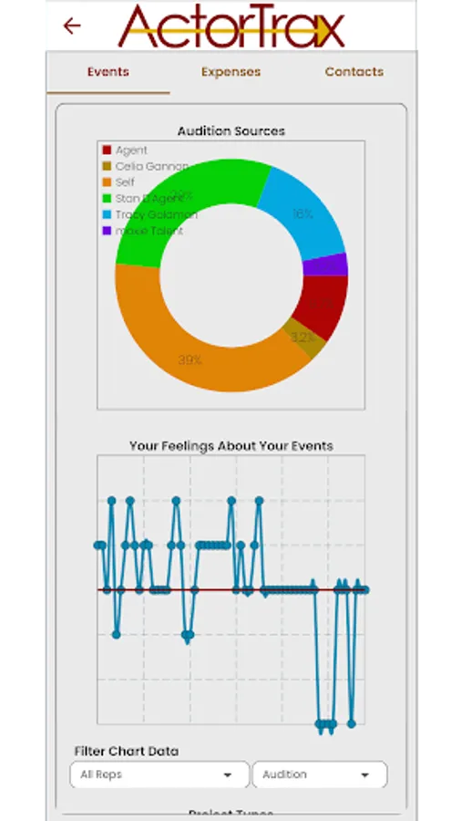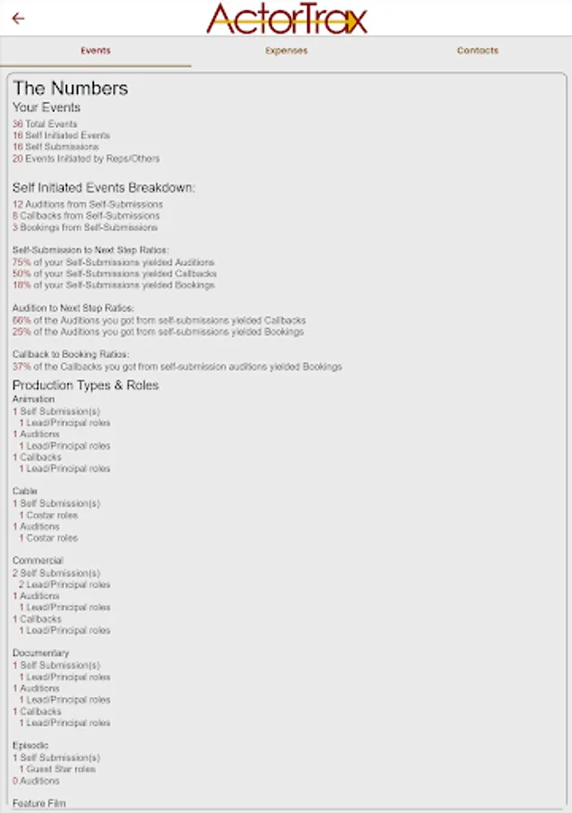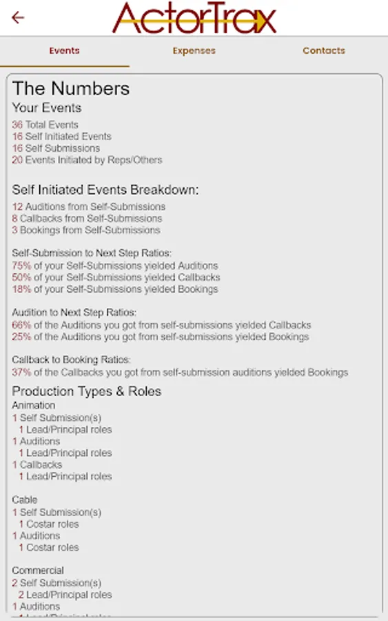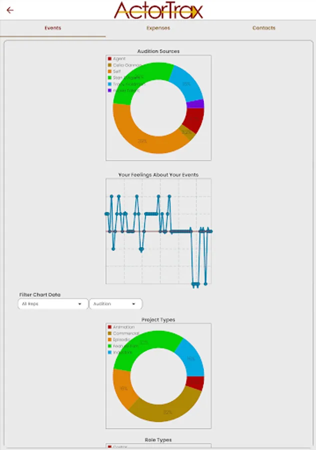 With a few taps, ActorTrax logs your progress from submission to booking, your industry contacts, and your expenses.