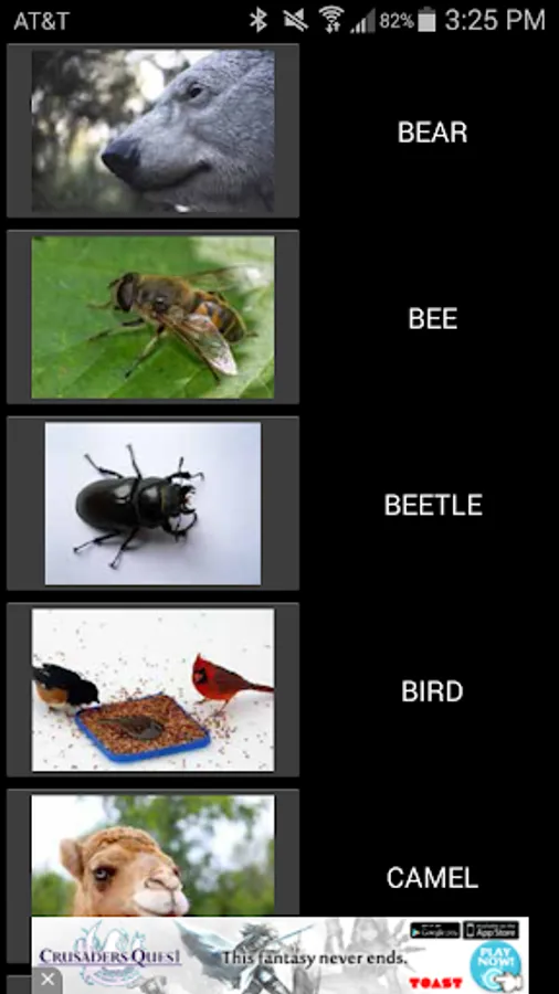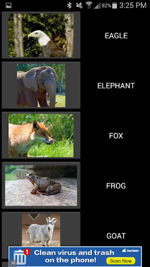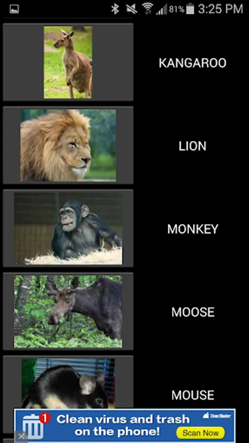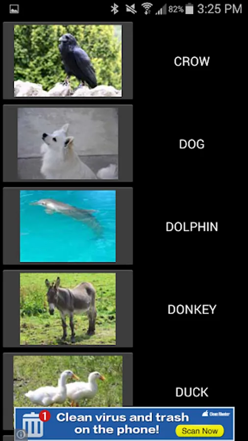 Hear the sounds that 50 animals make! Animals include: dog, cat, bear, alligator, bat, bee, beetle, bird, camel, chicken, cow, coyote, cricket, crow, dolphin, donkey, duck, eagle, elephant, fox, frog, goat, hippo, horse, hummingbird, hyena, jaguar, kangaroo, lion, monkey, moose, mouse, ostrich, owl, parrot, peacock, pig, rhino, rooster, seagull, seal, sheep, snake, squirrel, swan, tiger, turkey, walrus, whale, and wolf. This app includes a picture of each animal, the sound it makes, and the spelling of the animal's name. Toddlers, preschoolers, and even adults can enjoy this simple app. Enjoy!