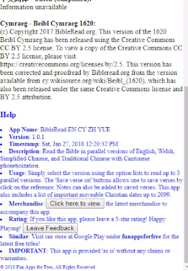 * Description: Read the Bible in parallel versions of English, Welsh, Simplified Chinese, and Cantonese.