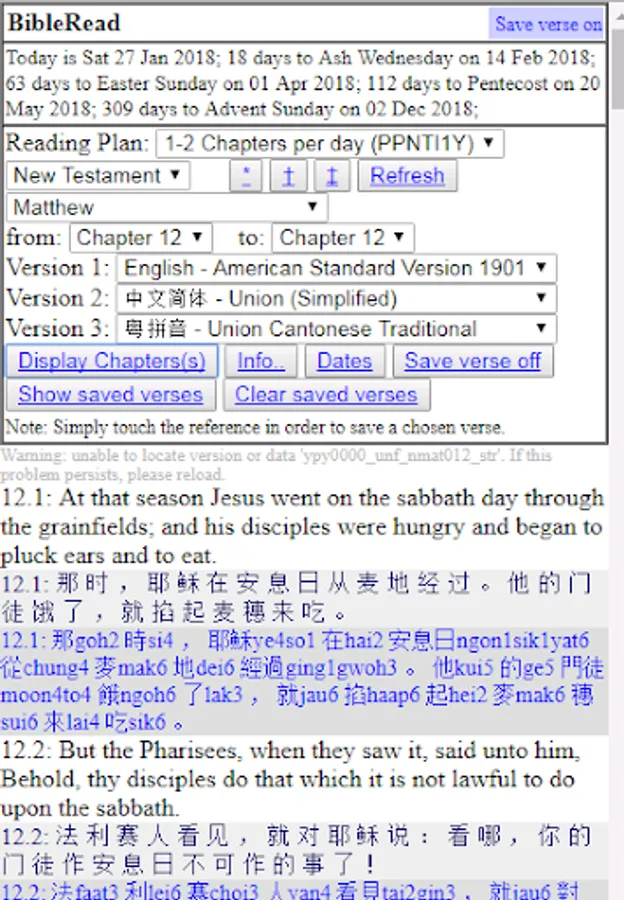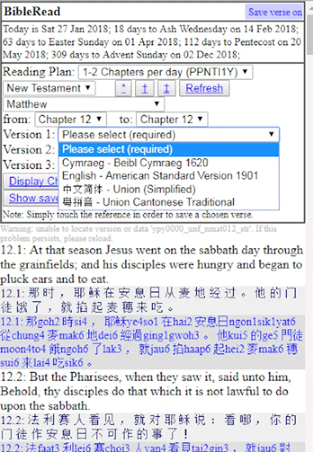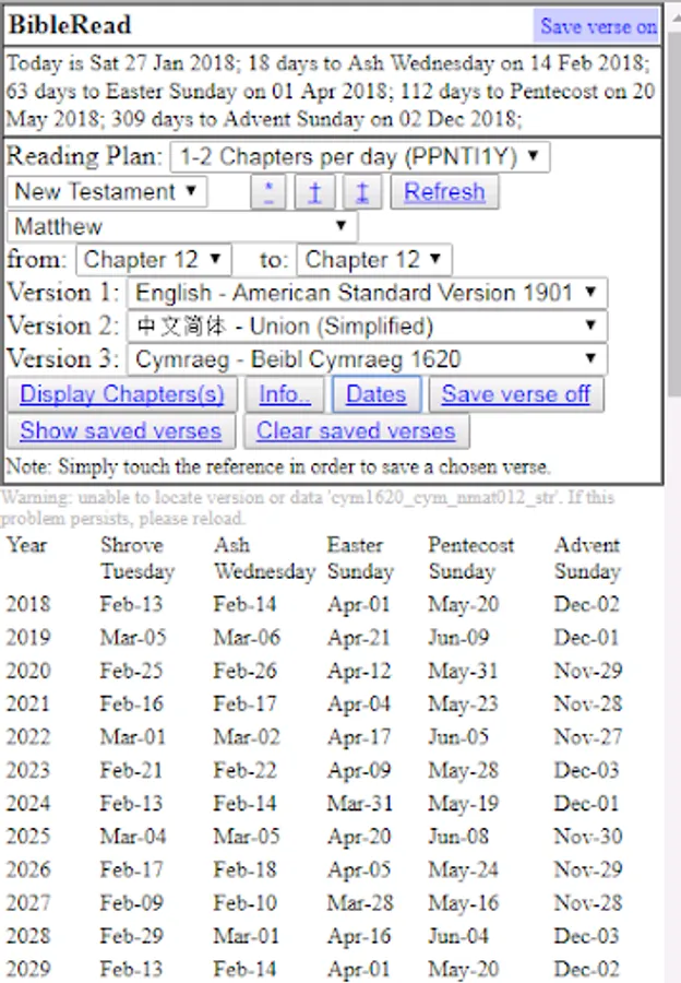 * Usage: Simply select the version using the option lists to read up to 3 parallel versions. The 'Save verse on' buttons allows one to save verses by click on the reference. Notes can also be added to saved verses. This app also includes a list of important move-able Christian dates.