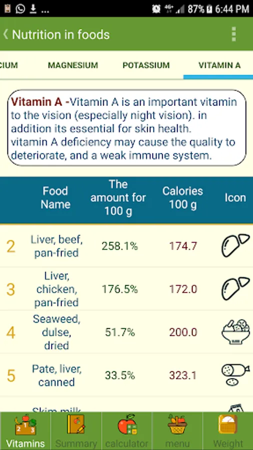 In addition, you can search for vitamin & minerals in foods. If you have nutrition deficiency, just view foods list sorted by this mineral.
