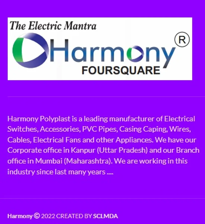 Harmony Polyplast is a leading manufacturer of Electrical Switches, Accessories, PVC Pipes, Casing capping, Wires, Cables, Electrical Fans, and other Appliances. We have our Corporate office in Kanpur (Uttar Pradesh) and our Branch office in Mumbai (Maharashtra). We provide quality products and services to our customers at economical prices. And we do not compromise the quality and durability of the goods we manufacture. We are working in this industry for the last many years ....