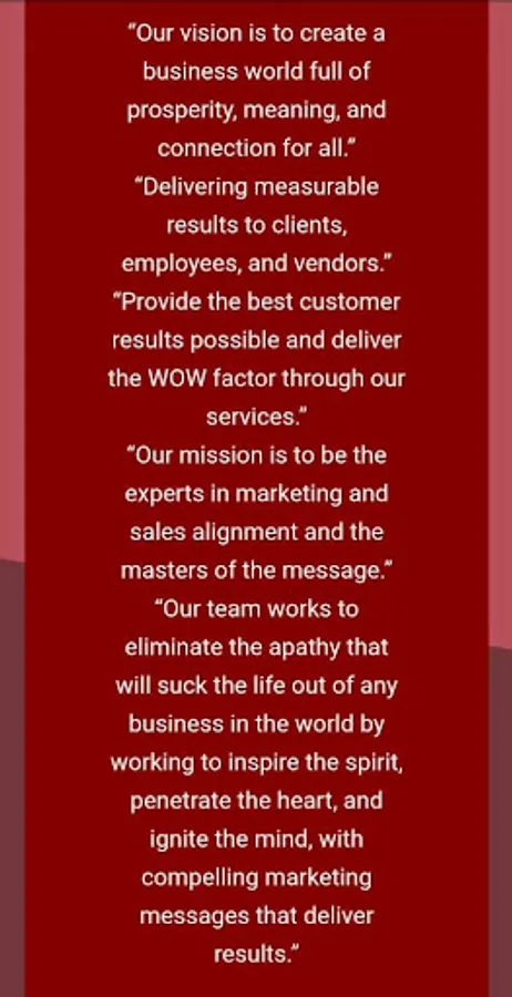 “Our team works to eliminate the apathy that will suck the life out of any business in the world by working to inspire the spirit, penetrate the heart, and ignite the mind, with compelling marketing messages that deliver results.”