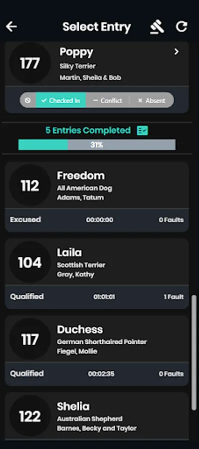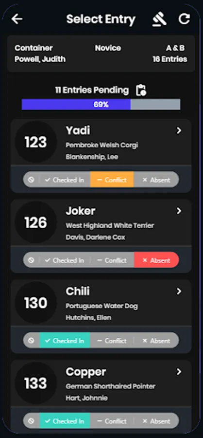 Exhibitors can self check-in, indicate the have a conflict or absent (pulled). They can view the current running order to and view their results in real time.