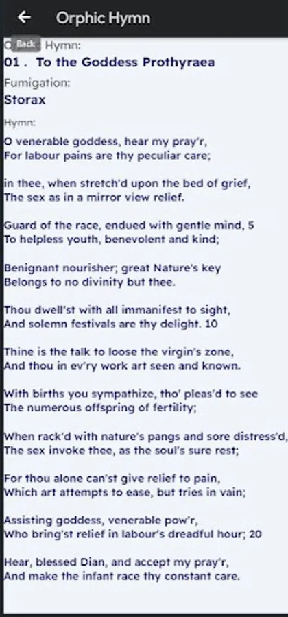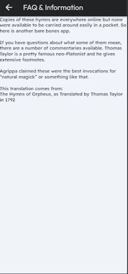 The Hymns of Orpheus, as Translated by Thomas Taylor in 1792. At this time they are just in English, I do not include the Greek. Also, I have left off the footnotes. This is just a pocket copy for the travelling "invocator".