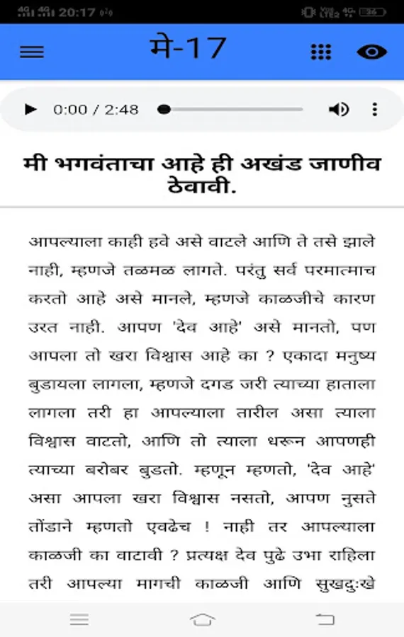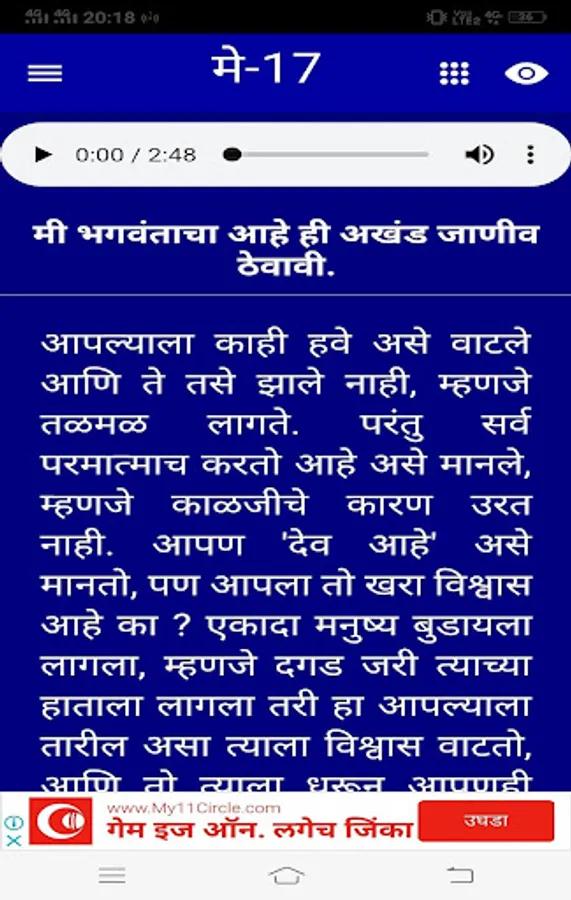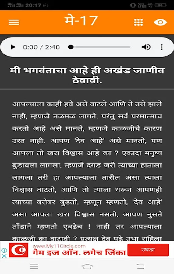 This app contains Shree.Brahmchaitany Maharaj's 365 days pravachans ,Ram-navami, Das-Navami pravachane.Namaskar Trayaodashi.