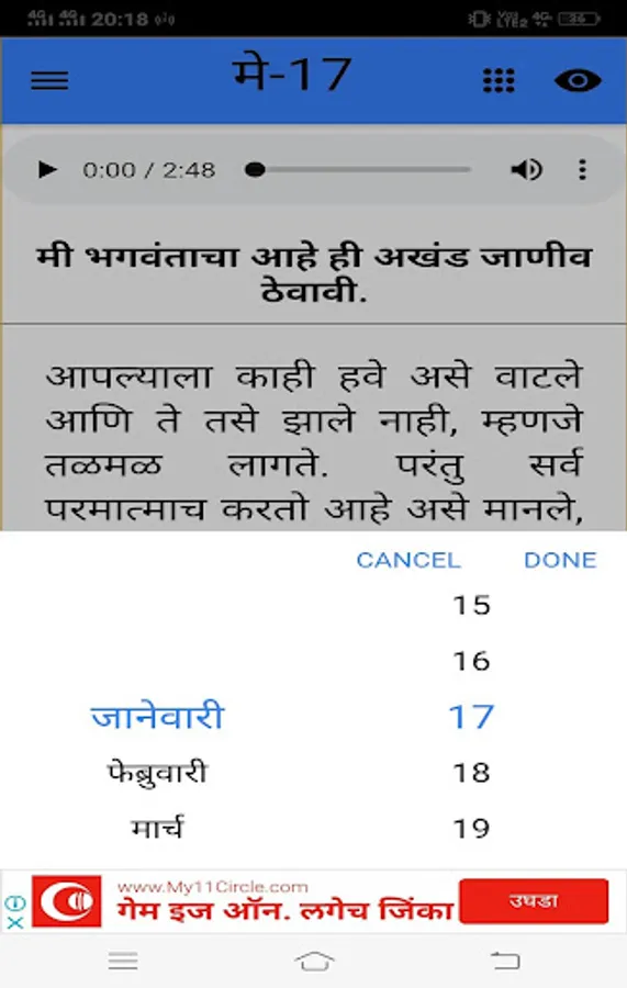 1) Main feature is that it shows TODAYS PRVACHAN on main page.User can navigate to other days pravachan by tapping on the date and then select the desired date and click OK.
